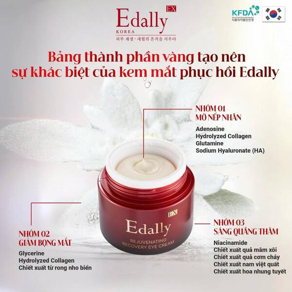Kem dưỡng mắt Edally EX Hàn Quốc có các thành phần chính mang lại công dụng hiệu quả trong việc chăm sóc chuyên biệt cho vùng da quanh mắt.