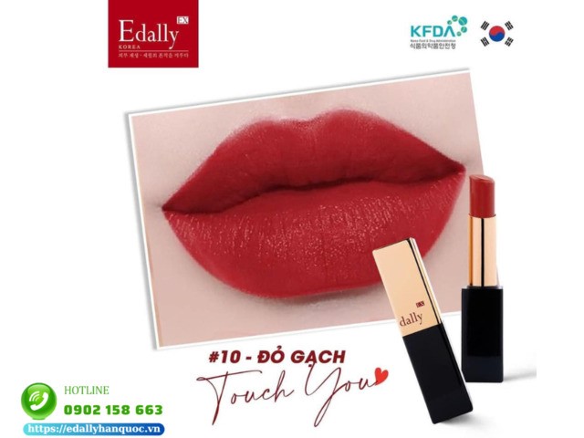 Son môi Collagen Edally EX màu 10 Touch You - Đỏ gạch quyễn rũ: Đỏ gạch tông màu quốc dân với sự biến hóa đa dạng các phong cách khác nhau cho các cô nàng, từ sự thanh lịch nhẹ nhàng, đến quyến rũ và mạnh mẽ. Màu son 10 Edally như một vẻ đẹp hoàn hảo, tạo nên sự nổi bật thật rực rỡ.