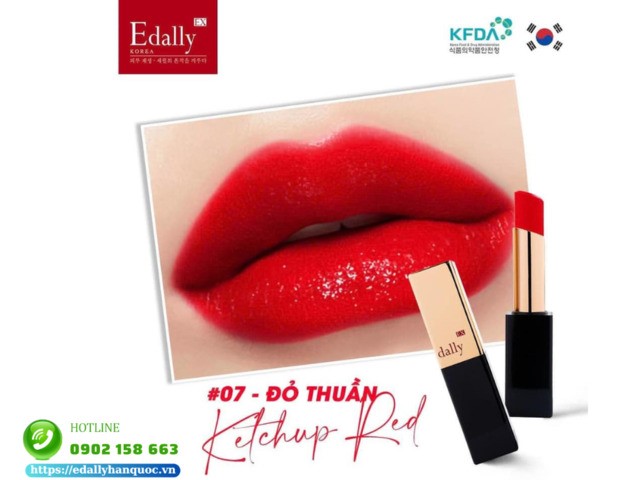 Son môi Collagen Edally EX Màu 07 Ketchup Red - Đỏ thuần phù hợp với những nàng cá tính, táo bạo. Màu son rất dễ phối hợp đa dạng phong cách: Những bạn dưới 25 tuổi khi đi phỏng vấn hoặc tham dự các sự kiện quan trọng nếu muốn trông trưởng thành và dày dặn hãy sử dụng Ketchup Red đánh trọn môi. Ngược lại, nếu muốn trông trẻ trung hơn, hãy sử dụng son đánh lòng môi hoặc ombre.